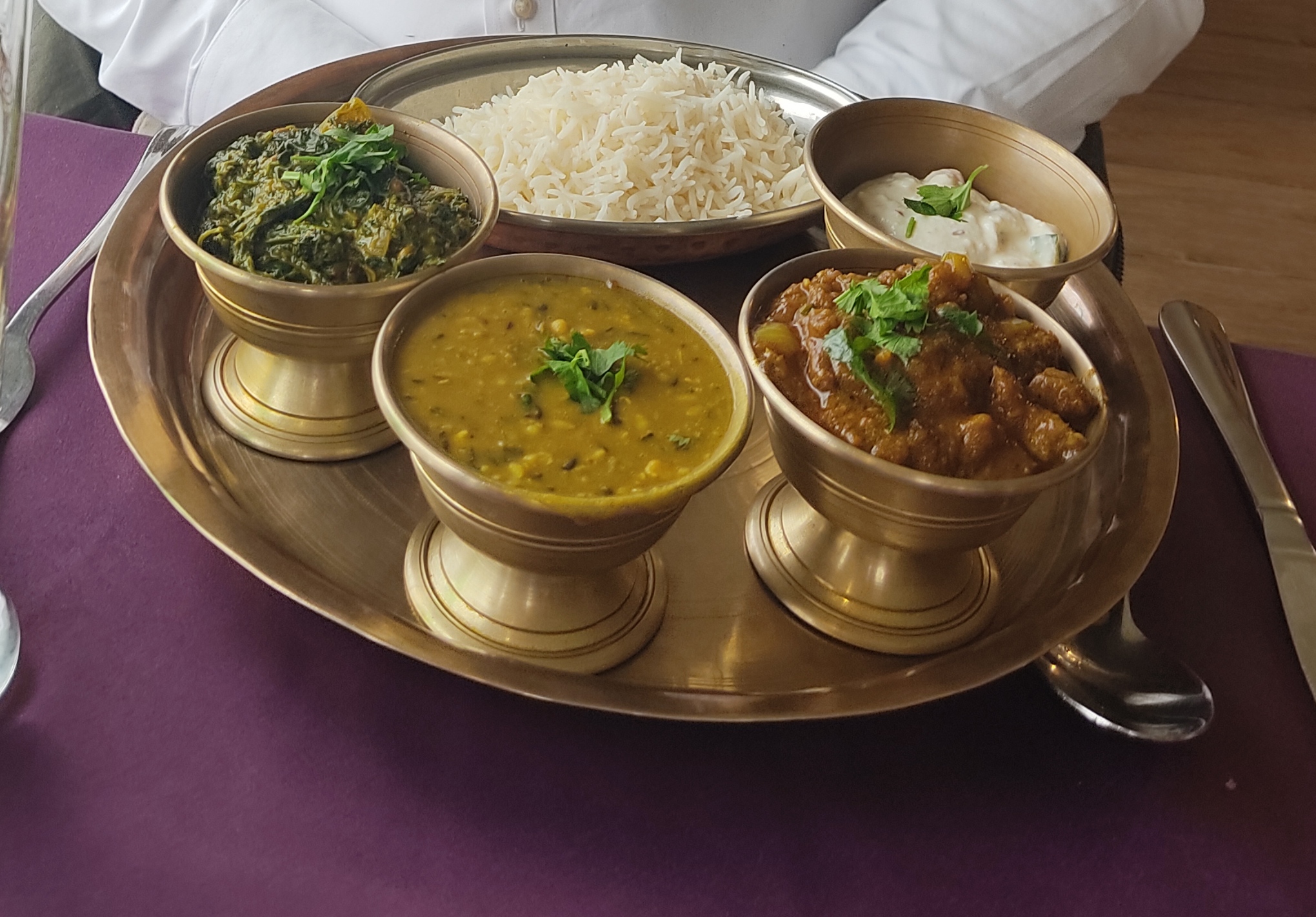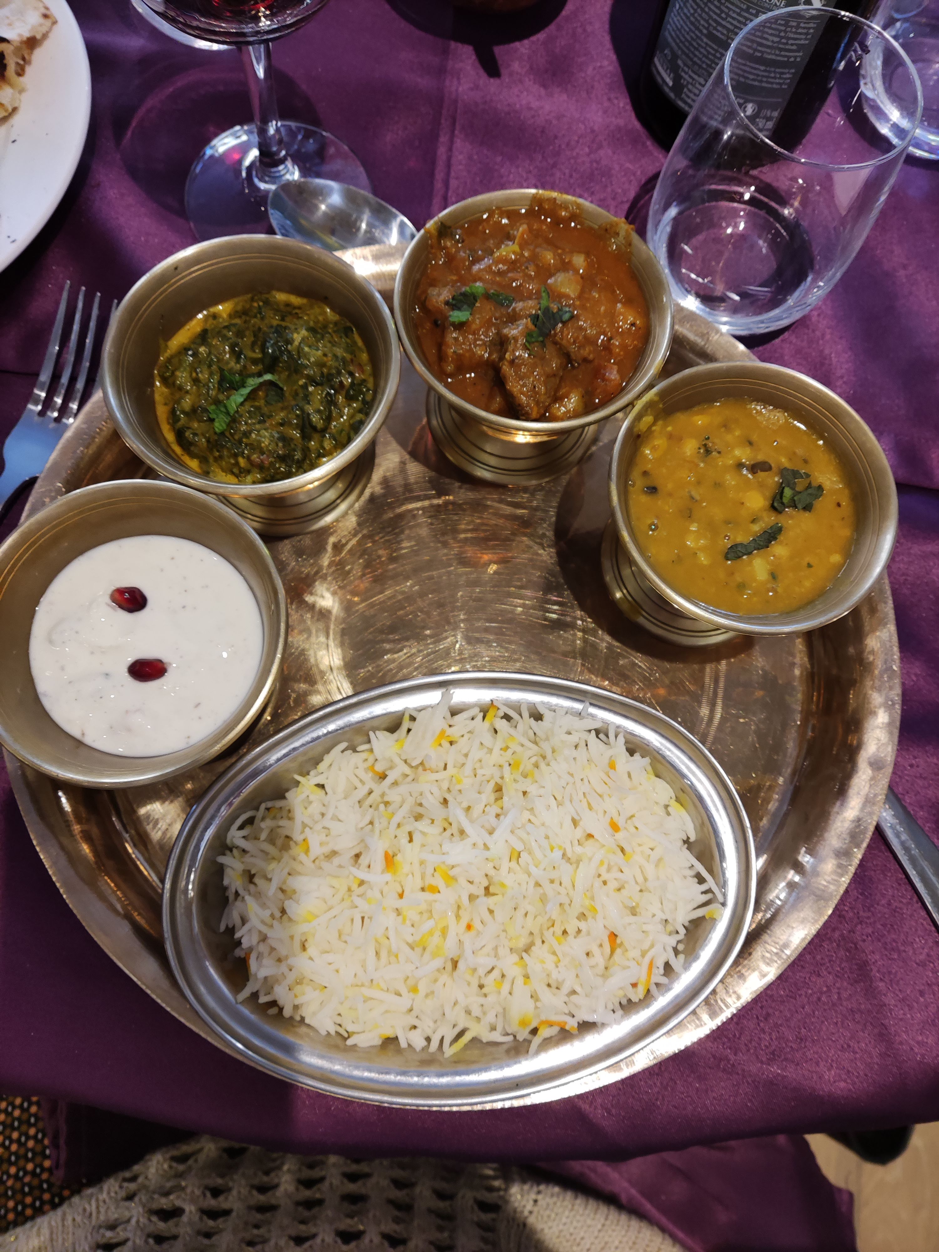 Nous nous y sommes arrêtés sur le chemin du retour à Paris. Thali commandé en versions légumes et viande. J'ai également commandé des brochettes de poulet. Tout était chaud et délicieux. Le thali était servi sur des plateaux métalliques que je n'ai vus qu'en Inde. J'ai été tellement impressionné par la présentation.
