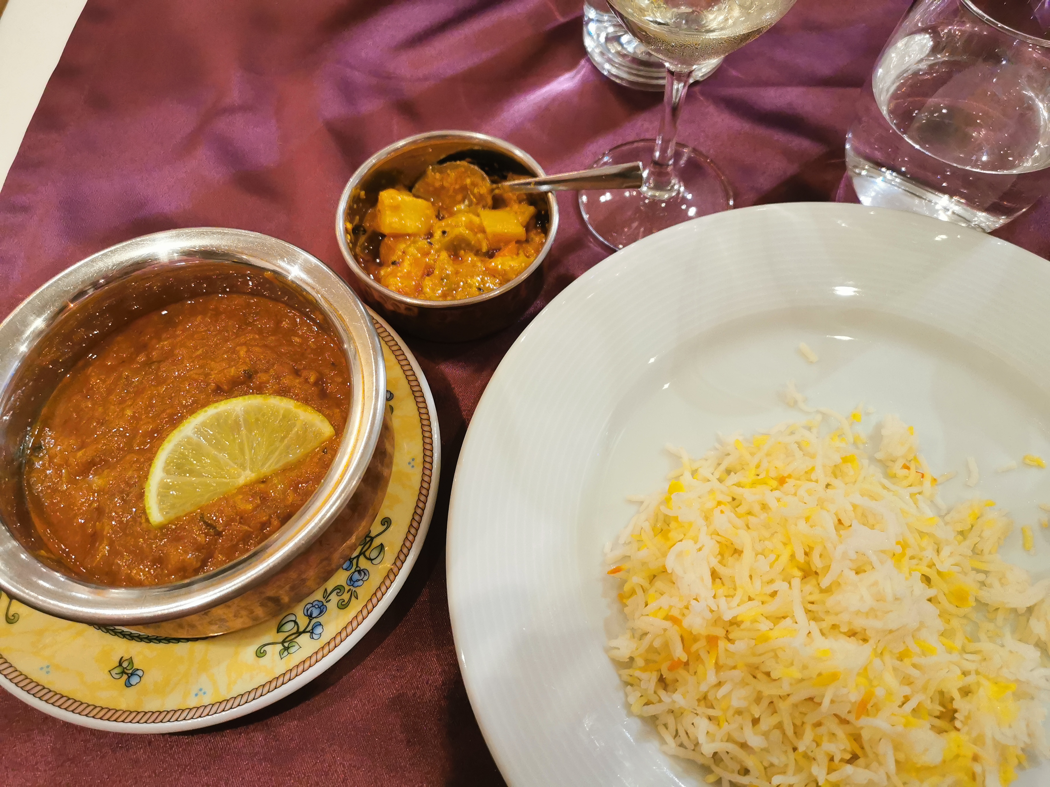 Samedi midi. Ambiance calme. Repas riche en saveurs et très copieux (un cheese naan chacun, un riz pour 2 et un plat chacun). Service très aimable. On reviendra !